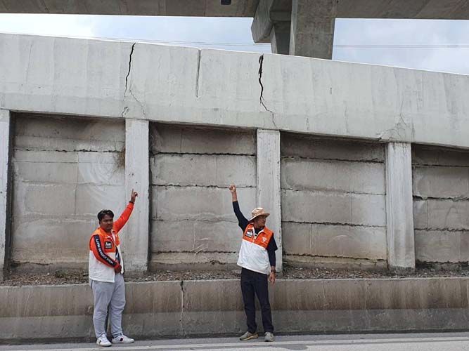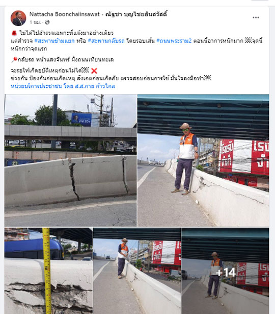และโพสต์อีกว่า "ไม่ได้ไปสำรวจเฉพาะที่แจ้งมาอย่างเดียว แต่สำรวจ #สะพานข้ามแยก หรือ #สะพานกลับรถ โดยรอบเส้น #ถนนพระราม2 ตอนนี้อาการหนักมาก จุดนี้หนักกว่าจุดแรก กลับรถ หน้าแสงจันทร์ ฝั่งถนนเทียนทะเล จะรอให้เกิดอุบัติเหตุก่อนไม่ได้ ช่วยกัน ป้องกันก่อนเกิดเหตุ สังเกตก่อนเกิดภัย ตรวจสอบก่อนการใช้ มั่นใจลงมือทำ" .-008