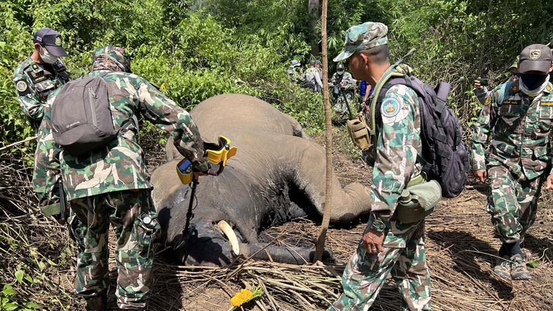 จากการสอบถาม นายนเรศ ศรีบุรินทร์ เจ้าหน้าที่เขตรักษาพันสัตว์ป่าภูหลวง เปิดเผยว่า จากการตรวจสอบ โดยการใช้เครื่องวัดหาวัตถุ พบมีรอยการสุน ปืนลูกซอง ประมาณ 6-7 รู และตรวจพบวัตถุ ที่บริเวณ หัวช้าง มี 4 จุด และจุดที่กระสุน จะทำให้ช้างตายได้ จะเป็นจุดหน้าผากของช้าง ที่เป็นรู ที่ถูกระสุนยิง ขนาดของลูกปืน ยังไม่แน่ชัด ต้องผ่าพิสูตรออกมาดู และเท่าที่ดูคาดว่า จะเป็นกระสุนปืน แม็คนั้ม หรือ ไรเฟิ้น ตัวนี้ เป็นช้างเพศผู้ อายุ ประมาณ 30+ ปี ไม่เกิน 40 ปี ในกลุ่มนี้ จะเป็นช้าง ที่เจ้าหน้าที่ ที่เราเฝ้าติดตามอยู่ จะมีทั้งหมด 3 ตัว ตัวที่ ตายนี้ คาดว่า เป็นตัวเล็กสุด ซึ่งเป็นตัวผู้ทั้งหมด ตัวที่ตายนี้ คาดว่า จะเสียชีวิตมาแล้ว ไม่ต่ำกว่า 6-7 วัน และจุดที่ยิงเข้าหน้าผาก ของช้าง จะเป็นการยิงจากบนที่สูง ที่กดลง เพราะอยู่ หน้าผาก เหนือตาขึ้นไป และจากการถูยิงก็ต้องถูยิงบนบนที่สูง แล้วช้าง ได้เดินลงมาตายที่บริเวณนี้ ซึ่ง ได้ให้เจ้าหน้าที่ ได้เดินสำรวจ บริเวณโดยรอบ เพื่อหาหลักฐานเพิ่ม ขณะที่ช้าง จะได้รอเจ้าหน้าที่ จากกรม เข้ามาพิสูจน์ หาสาเหตุของการเสียชีวิต