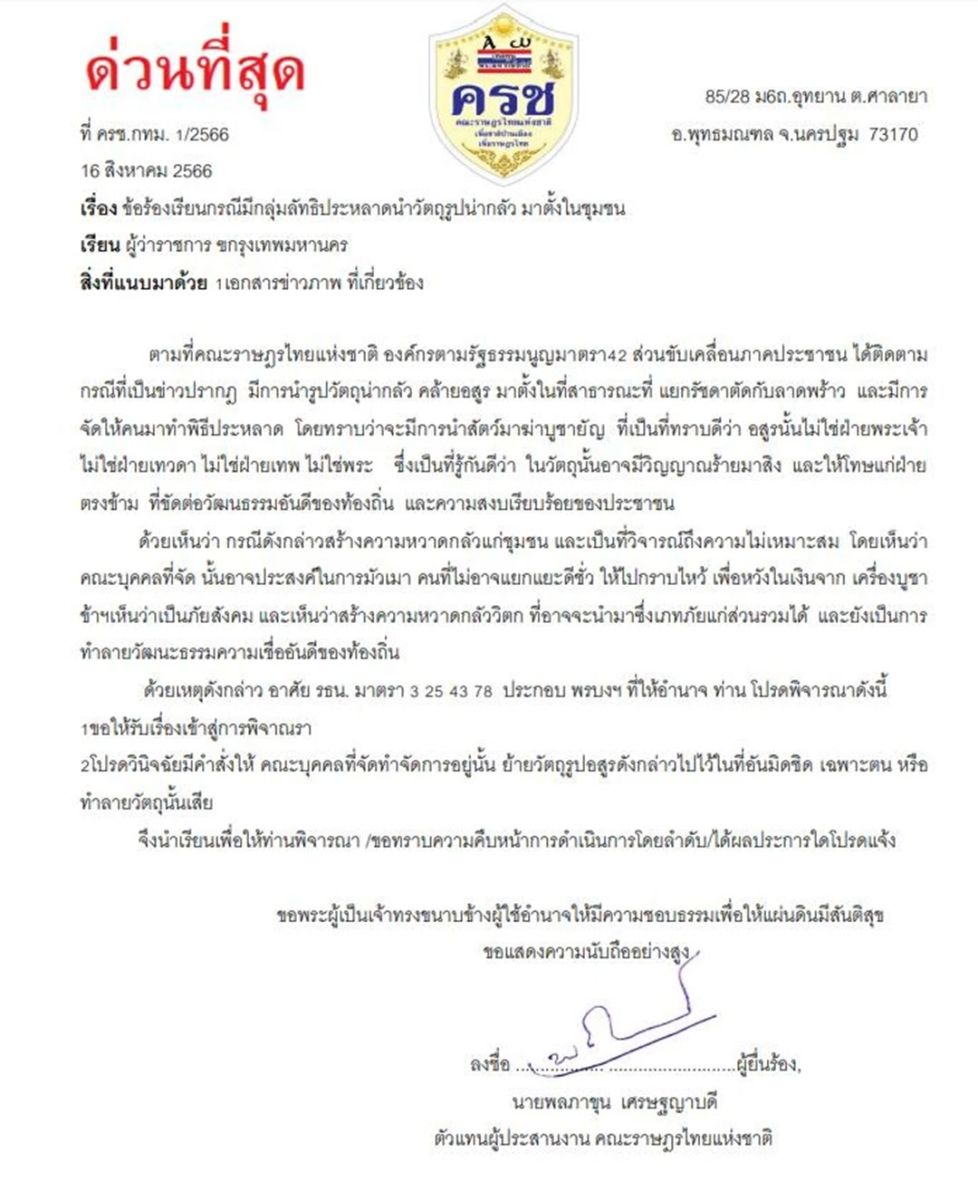 โดยหนังสือร้องเรียนระบุว่า "ตามที่คณะราษฎรไทยแห่งชาติ องค์กรตามรัฐธรรมนูญมาตรา 42 ส่วนขับเคลื่อนภาคประชาชน ได้ติดตามกรณีที่เป็นข่าวปรากฏ มีการนำรูปวัตถุน่ากลัว คล้ายอสูร มาตั้งในที่สาธารณะที่แยกรัชดาตัดกับลาดพร้าว และมีการจัดให้คนมาทำพิธีประหลาด โดยทราบว่าจะมีการนำสัตว์มาฆ่าบูชายัญ ที่เป็นที่ทราบดีว่าอสูรนั้นไม่ใช่ฝ่ายพระเจ้า ไม่ใช่ฝ่ายเทวดา ไม่ใช่ฝ่ายเทพ ไม่ใช่พระ ซึ่งเป็นที่รู้กันดีว่า ในวัตถุนั้นอาจมีวิญญาณร้ายมาสิง และให้โทษแก่ฝ่ายตรงข้าม ที่ขัดต่อวัฒนธรรมอันดีของท้องถิ่น และความสงบเรียบร้อยของประชาชน