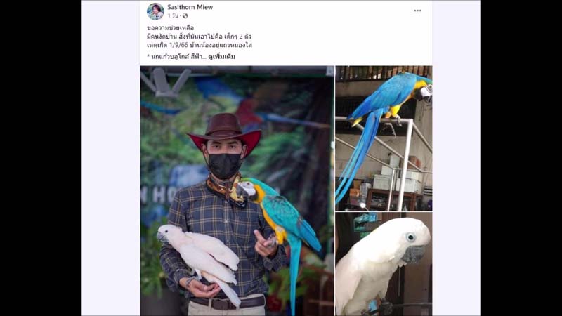 3 ก.ย.66 ผู้สื่อข่าวรายงานว่า ผู้ใช้เฟสบุ๊กท่านหนึ่ง โพสต์คลิปและรูปภาพนกแก้วมาคอร์ ลงในเพจอุดร มีด่าน มีข่าว มีหมอลำ งานบุญ มีเหตุการณ์ต่าง ๆ บอกด้วย เพื่อขอความช่วยเหลือ พร้อมกับระบุข้อความว่า มีคนงัดบ้าน สิ่งที่มันเอาไปคือ เด็กๆ 2 ตัวเหตุเกิด 1/9/66 บ้านน้องอยู่แถวหนองใส นกแก้วบลูโกล์ สีฟ้า นกกระตั้ว สีขาว หัวด้านในสีเหลือง นกแก้วขวัญใจเด็ก ๆ นกออกงาน เด็กๆ อุดร รู้จักน้อง (น้องมีห่วงขาทั้ง 2 ตัว) คนร้ายอาจยังกบดานในอุดร หากใครได้ยินเสียงแปลกๆ แถวบ้าน รบกวนตรวจสอบดูให้หน่อยนะคะ น้องไม่คุ้นที่แปลก จะร้องเสียงดัง หนวกหู ปล. แจ้งความแล้วค่ะ แต่รบกวนพี่ๆ เป็นหู เป็นตาช่วยแจ้งเบาะแส อีกทางนึงค่ะ พร้อมทิ้งเบอร์ติดต่อไว้ ต่อมาวันที่ 3 สิงหาคม 2566 ผู้สื่อข่าวได้เดินทางไปเจ้าของโพสต์และเจ้าของนกเพื่อพูดคุยสอบถาม