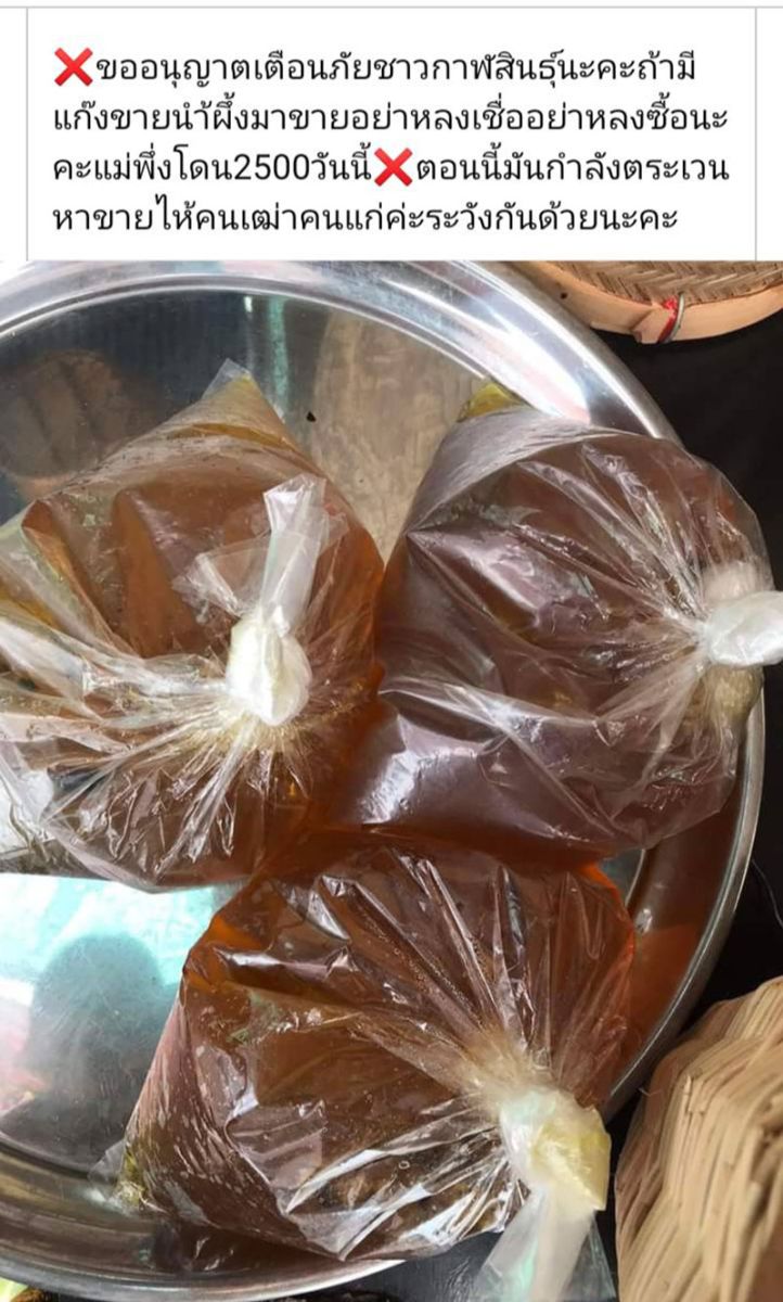24 กันยายน 2566 ผู้สื่อข่าวได้รับแจ้ง มีผู้ใช้เฟสบุกรายหนึ่ง โพสต์ภาพถุงพลาสติกบรรจุของเหลว สีน้ำตาล ใส่ถาดอลูมิเนียม 3-6 ถุง พร้อมข้อความ X ขออนุญาตเตือนภัยชาวกาฬสินธุ์นะคะ ถ้ามีแก๊งขายน้ำผึ้งมาขาย อย่าหลงเชื่อ อย่าหลงซื้อนะคะ แม่พึ่งโดน 2,500 บาทวันนี้ X ตอนนี้กำลังตระเวนหาขายให้คนเฒ่าคนแก่ค่ะ ระวังกันด้วยนะคะ