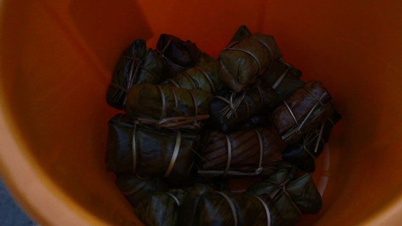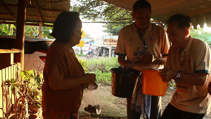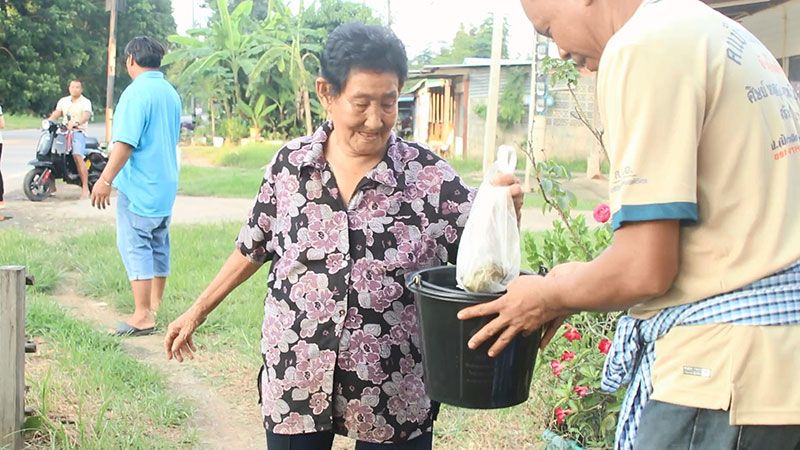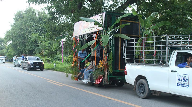 ก่อนที่จะร่วมกับชาวบ้านรวมกว่า 30 คน เคลื่อนขบวนรถแห่ที่ประดับด้วยต้นกล้วย ต้นอ้อย พร้อมรถเครื่องเสียงสร้างความครื้นเครง ในการสืบสานประเพณีขอทานข้าวต้มมัด ที่ชาวบ้านนิยมทำกันในช่วงวันออกพรรษา โดยมีกลุ่มชาวบ้านร่วมกันถือบาตรและกระถาง เดินตามหมู่บ้านร้องเพลงกลอนขอข้าวต้ม เดินเข้าไปยังบ้านเรือน ขอทานให้ชาวบ้านร่วมทำบุญข้าวต้มมัด