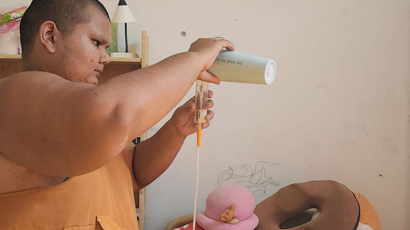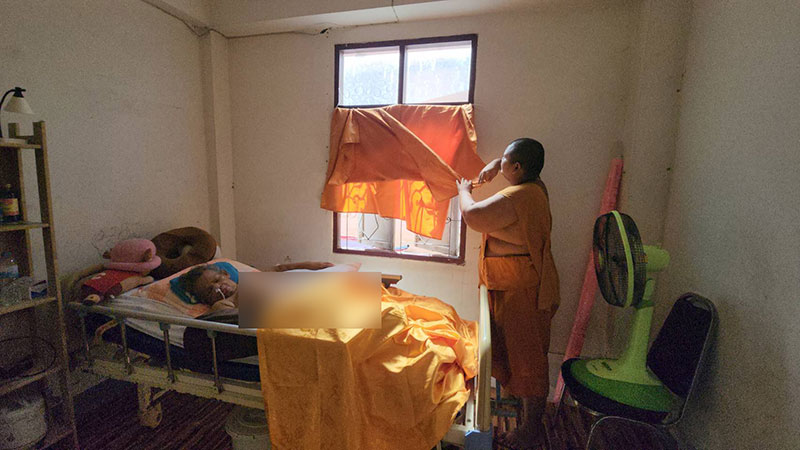 กระทั่ง 2 อาทิตย์ที่ผ่านมา ขาไม่มีแรง ไม่มีกำลังไปเฉยๆ ไม่สามารถช่วยเหลือตัวเองได้ ตนเลยขอเจ้าอาวาสวัดสุทธาวาส พระมหาฐาวร ฐานวโร เจ้าคณะอำเภอบางละมุง ขอนำโยมแม่มาอยู่ที่วัด ท่านก็เมตตาให้มาพักในกุฎิชั้นล่าง เพื่อง่ายต่อการดูแล ไม่ต้องเทียวไปเทียวมาระหว่างห้องเช่า กับ วัด อีกทั้งเป็นการลดค่าใช้จ่าย ค่าเช่าบ้าน-ค่าน้ำ-ไฟ คงเหลือรายจ่ายสิ้นเปลือง เช่น ค่าแพมเพิร์ส ค่าอาหารเหลว สำหรับผู้ป่วยที่เป็นรายจ่ายประจำเท่านั้น