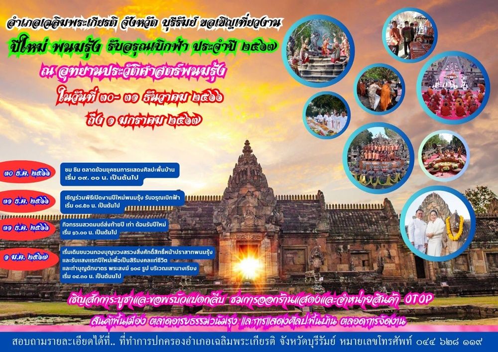 วันนี้ (21 ธ.ค.66) นายศักดิ์กรินทร์ คูณประโคน นายอำเภอเฉลิมพระเกียรติ จังหวัดบุรีรัมย์ เปิดเผยว่า อำเภอเฉลิมพระเกียรติ ร่วมกับจังหวัดบุรีรัมย์ อุทยานประวัติศาสตร์พนมรุ้ง เทศบาล องค์การบริหารส่วนตำบล(อบต.) ใน อ.เฉลิมพระเกียรติ และภาคเอกชน จัดงาน “ปีใหม่ พนมรุ้ง รับอรุณเบิกฟ้า” ประจำปี 2567 ขึ้นในระหว่างวันที่ 30-31 ธันวาคม 2566 และวันที่ 1 มกราคม 2567 ณ อุทยานประวัติศาสตร์พนมรุ้ง อ.เฉลิมพระเกียรติ จ.บุรีรัมย์
