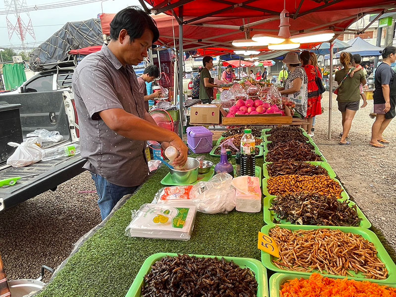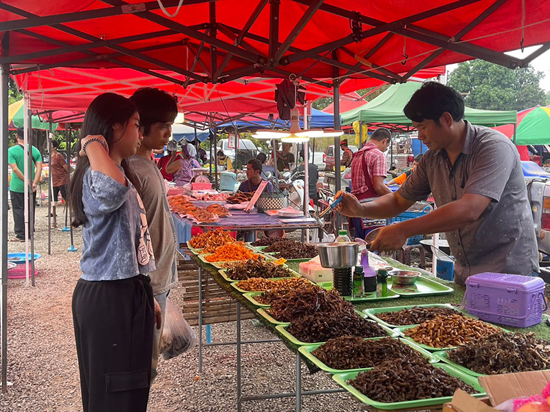 ร้านคุณณัฐ เปิดขายอาหารจำพวกแมลงทอด กล่าวว่า อาหารทอดที่ลูกค้านิยมซื้อรับประทาน คือดักแด้หรือหนอนไหมทอดจะขายดีที่สุด ซึ่งลูกค้าบอกว่าอร่อย เค็มๆ มันๆ ขายในยราคาตักละ 20 บาท 3 ตัก 50 บาท โดยเจ้าตัวจะเปิดขายที่ตลาดแห่งนี้ 3 วัน คือวันจันทร์ วันพุธ วันเสาร์ ตั้งแต่เวลา 13.00 – 20.00 น. ส่วนวันอื่นก็ไปขายตามตลาดนัดในชุมชนและงานวัดในพื้นที่.012