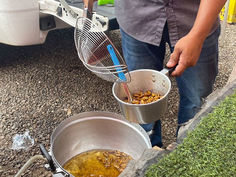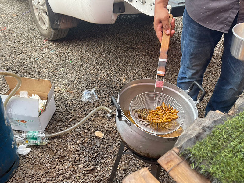 จากการตรวจสอบ ที่บริเวณตลาดนัด ข้างอำเภอศรีมหาโพธิ จ.ปราจีนบุรี พบ “ร้านคุณณัฐ” ที่เปิดร้านขายแมลงนานาชนิดทอดขายมานานกว่า 10 ปี จนเป็นอาชีพที่สร้างรายได้หลัก สามารถเลี้ยงครอบครัวได้อย่างสบาย “ร้านคุณณัฐ” มีลูกค้าเดินทางมาอุดหนุนอย่างต่อเนื่อง โดยเฉพาะดักแด้ทอดเป็นอาหารที่ยอดนิยมของคนไทย เนื่องจากทางร้านจะนำตัวดักแด้ลงไปทอดให้สุก ก่อนนำมาปรุงด้วยเครื่องปรุงรส ใส่ผงพริกไทยพร้อมฉีดด้วยซอสปรุงรสก็สามารถทานได้ทันที