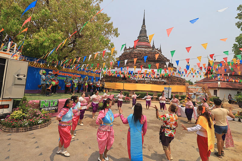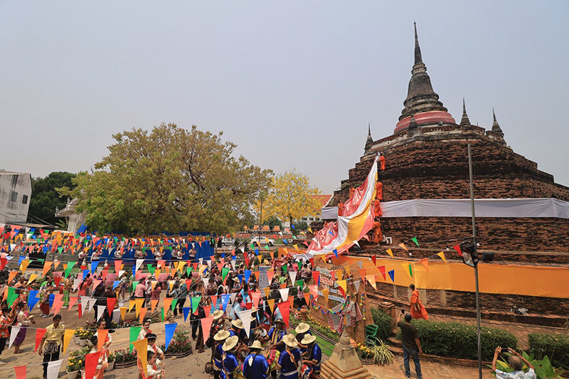 จากนั้นได้เปิดให้ประชาชนเขียนชื่อลงบนผืนผ้าแพร 3 สี คือสีเงิน สีทอง สีนาค ความยาวกว่า 30 เมตร เพื่อความเป็นสิริมงคลแก่ตนเองและครอบครัว ก่อนพร้อมใจกันตั้งขบวนแห่ผืนผ้า และนำผ้าขึ้นไปห่มเจดีย์หลวง อายุกว่า 700 ปี ตามประเพณีไทยในช่วงเทศกาลสงกรานต์.012