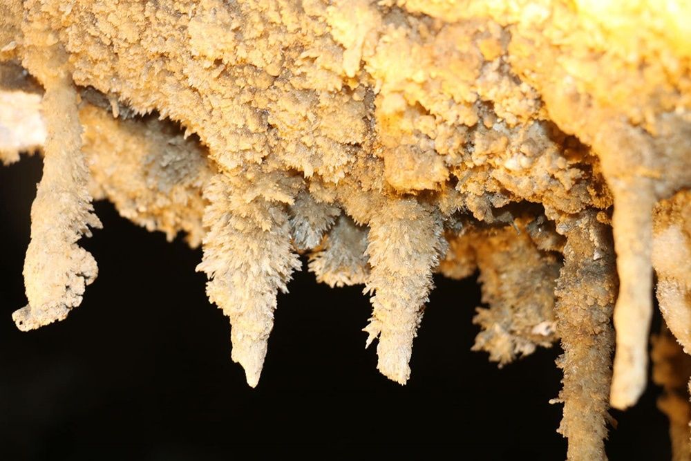 จากนั้นก็จะพบกับสภาพเป็นห้องโถงค่อนข้างใหญ่ มีก้อนหินโผล่ขึ้นมาจากดินหลากหลายขนาด เมื่อใช้ไฟฉายสาดส่องไปตามผนังถ้ำพบว่าลักษณะมีหินงอก หินย้อยห้อยระย้าเป็นรูปทรงคลายหยดเทียนเต็มพื้นผนังถ้ำประกายงดงามแปลกตา บางจุดคล้ายรูปหยดน้ำเป็นแท่ง ๆ คลายรังผึ้ง เมื่อนำไฟส่องใกล้ ๆ จะมีลักษณะระยิบระยับคล้ายกากเพชร ด้านในยังแบ่งเป็นห้อง ๆ มีหินงอกหินย้อยลักษณะเป็นดอกขาวโพลนคล้ายปุยนุ่น เป็นเกล็ดหิมะ บางจุดกำลังงอกเป็นแท่งเล็กๆ เปล่งประกายสวยงามเมื่อกระทบกับแสงไฟ ด้านล่างในส่วนที่ลึกลงไปดูคลายกับเป็นธารน้ำไหลลงสู่ใต้พื้นดิน แต่เนื่องจากอยู่ในช่วงหน้าแล้ง จึงทำให้น้ำแห้งเห็นดิน