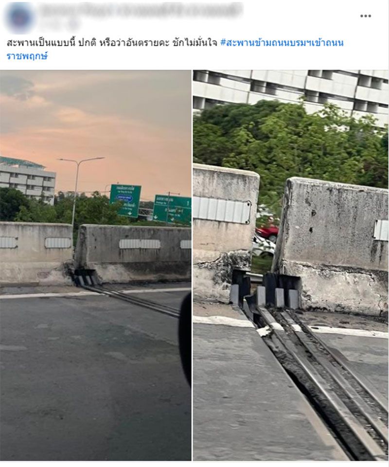 วันที่ 17 พฤษภาคม 2567 สมาชิกกลุ่มเฟซบุ๊ก ข่าวนนทบุรี ถึง ชาวนนทบุรี รายหนึ่ง ได้โพสต์เป็นภาพสะพานข้ามถนนบรมฯ เข้าถนนราชพฤกษ์ ที่มีรอยต่อแยกออกจากกัน โดบระบุข้อความว่า