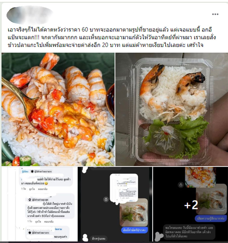 โดยระบุข้อความว่า "เอาจริงๆ ก็ไม่ได้คาดหวังว่าราคา 60 บาท จะออกมาตามรูปที่ขายอยู่แล้ว แต่เจอแบบนี้ อกอีแป้นจะแตก จกตากันมากกก และเห็นบอกจะเอามาแก้ตัวให้วันอาทิตย์ที่ผ่านมา เราเลยสั่งข้าวปลาแกะไปเพิ่ม พร้อมจะจ่ายค่าส่งอีก 20 บาท แต่แม่ค้าหายเงียบไปเลยค่ะ เศร้าใจ"
