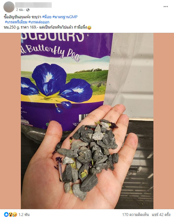 9 ก.ค.67 ผู้ใช้เฟซบุ๊กรายหนึ่ง โพสต์ภาพและข้อความผ่านกลุ่ม พวกเราคือผู้บริโภค ระบุข้อความว่า "ซื้ออัญชันอบแห้ง ระบุว่า #มีอย #มาตรฐานGMP #เกรดพรีเมี่ยม #เกรดส่งออก นน. 250 g. ราคา 169.- แต่เป็นก้อนหินไปแล้ว กำมือนึง"