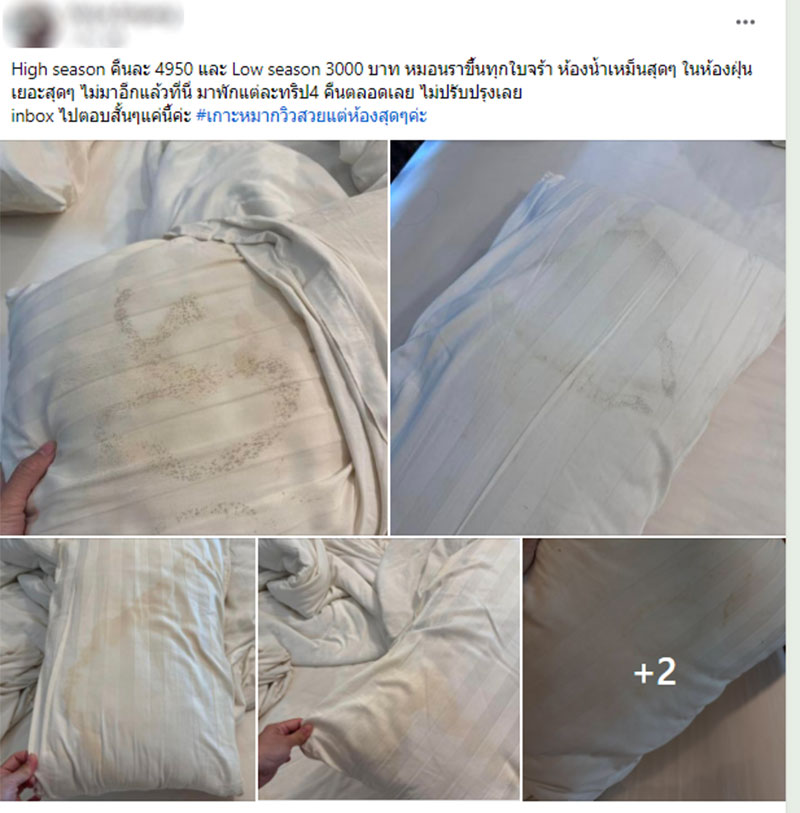 โดยผู้โพสต์เล่าว่า “High season คืนละ 4,950 และ Low season 3,000 บาท หมอนราขึ้นทุกใบจร้า ห้องน้ำเหม็นสุดๆ ในห้องฝุ่นเยอะสุดๆ ไม่มาอีกแล้วที่นี่ มาพักแต่ละทริป 4 คืนตลอดเลย ไม่ปรับปรุงเลยinbox ไปตอบสั้นๆแค่นี้ค่ะ #เกาะหมากวิวสวยแต่ห้องสุดๆค่ะ“