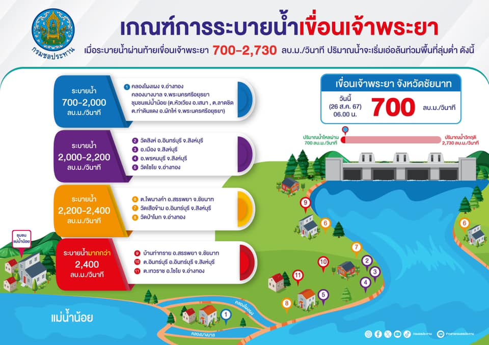 เขื่อนเจ้าพระยาตรึงการระบายน้ำในอัตรา 700 ลบ.ม./วินาที เตือนประชาชน 2 ฝั่ง อ่างทอง,อยุธยา ให้เฝ้าระวัง