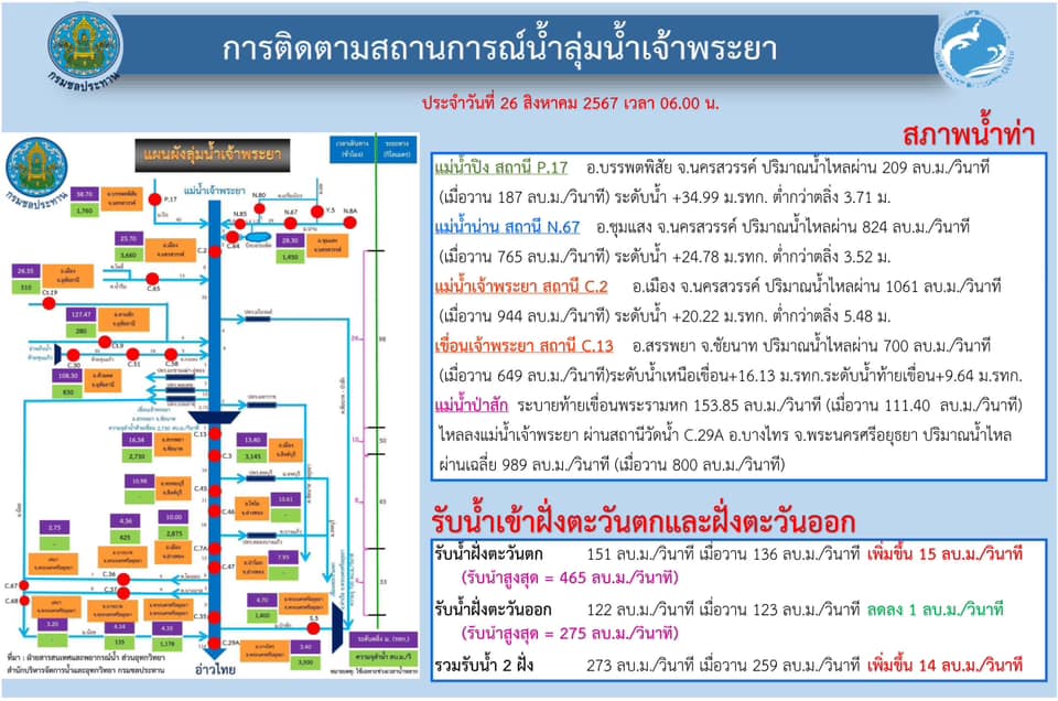 26 สิงหาคม 2567 กรมชลประทาน รายงานสถานการณ์ล่าสุดว่า ขณะนี้ เขื่อนเจ้าพระยาตรึงการระบายน้ำในอัตรา 700 ลบ.ม./วินาที โดยเตือนประชาชนริมน้ำให้เฝ้าระวังอย่างใกล้ชิดพร้อมยกของขึ้นที่สูง ดังต่อไปนี้