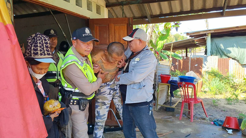 หลังได้รับแจ้งเจ้าหน้าที่ตำรวจชุดสืบสวน สภ.เฉลิมพระเกียรติ พร้อมด้วยเจ้าหน้าที่ตำรวจจราจรและสายตรวจ รวมทั้งผู้นำชุมชน พร้อมอุปกรณ์ไม้ง่าม ได้ลงพื้นที่ไปตรวจสอบตามที่ได้รับแจ้ง เมื่อไปถึงที่เกิดเหตุพบนายสมบูรณ์ หรือทิดบูรณ์ (ขอสงวนนามสกุล) อายุ 43 ปี เพราะเพิ่งสึกจากการบวชเป็นพระได้ประมาณ 1 เดือนเศษ ตะโกนโวยวายอยู่ในบ้าน และพบเศษชิ้นส่วนข้าวของเครื่องใช้ ถูกทุบแตกเสียหายกระจัดกระจายทั้งภายในบ้านและหน้าบ้าน