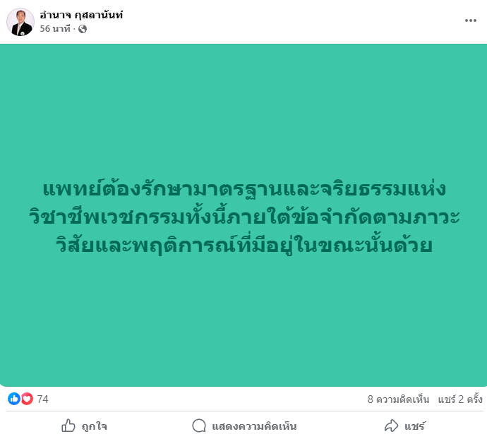2 ส.ค. 68 ศ.คลินิกนพ.อำนาจ กุสลานันท์ อดีตนายกแพทยสภา โพสต์เฟซบุ๊กหัวข้อ "แพทย์ต้องรักษามาตรฐานและจริยธรรมแห่งวิชาชีพเวชกรรมทั้งนี้ภายใต้ข้อจำกัดตามภาวะวิสัยและพฤติการณ์ที่มีอยู่ในขณะนั้นด้วย"
