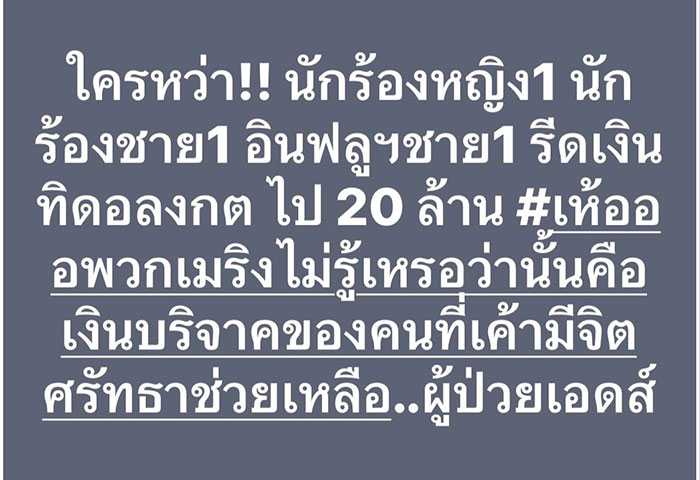 ล่าสุด เพจ ดาวแปดแฉก เผยข้อมูลเพิ่มเติมชี้เป้าบุคคลที่มีส่วนเกี่ยวข้องกับเรื่องเงินบริจาควัดพระบาทน้ำพุ โดยระบุว่า "ใครหว่า !! นักร้องหญิง 1 นักร้องชาย 1 อินฟลูฯ ชาย 1 รีดเงิน ทิดอลงกต ไป 20 ล้าน #เห้อออพวกเมริงไม่รู้เหรอว่านั้นคือเงินบริจาคของคนที่เค้ามีจิตศรัทธาช่วยเหลือ..ผู้ป่วยเอดส์"