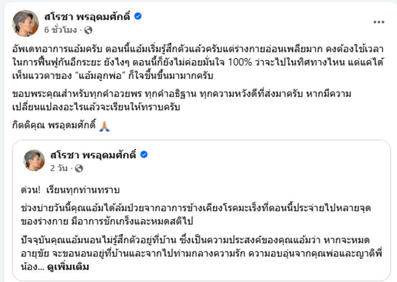 วันที่ 1 ตุลาคม 2568 จากกรณี ครอบครัวของ น.ส.สโรชา พรอุดมศักดิ์ หรือแอ้ม ผู้ประกาศข่าวชื่อดัง ได้โพสต์เฟซบุ๊กแจ้งว่า “ด่วน! เรียนทุกท่านทราบ ช่วงบ่ายวันนี้คุณแอ้มได้ล้มป่วยจากอาการข้างเคียงโรคมะเร็งที่ตอนนี้กระจายไปหลายจุดของร่างกาย มีอาการชักเกร็งและหมดสติไป ซึ่งปัจจุบันนอนไม่รู้สึกตัวอยู่ที่บ้าน ตามทื่เสนอข่าวไปแล้วนั้น ('แอ้ม สโรชา'ผู้ประกาศข่าวชื่อดัง ชักเกร็งหมดสติ พบมะเร็งกระจายหลายจุด)