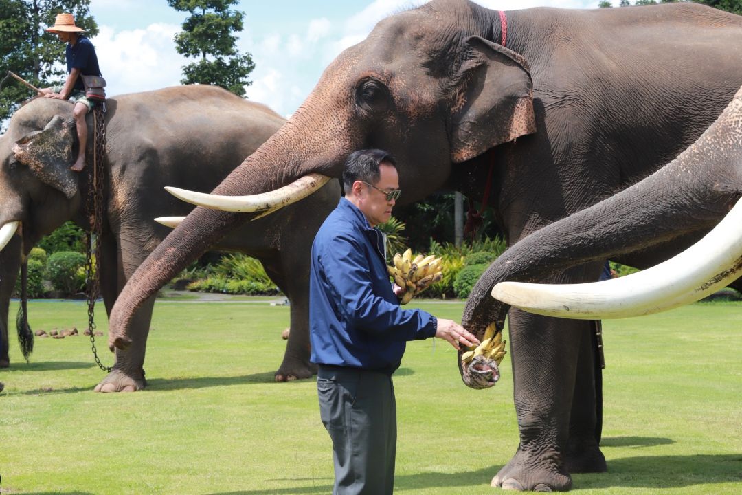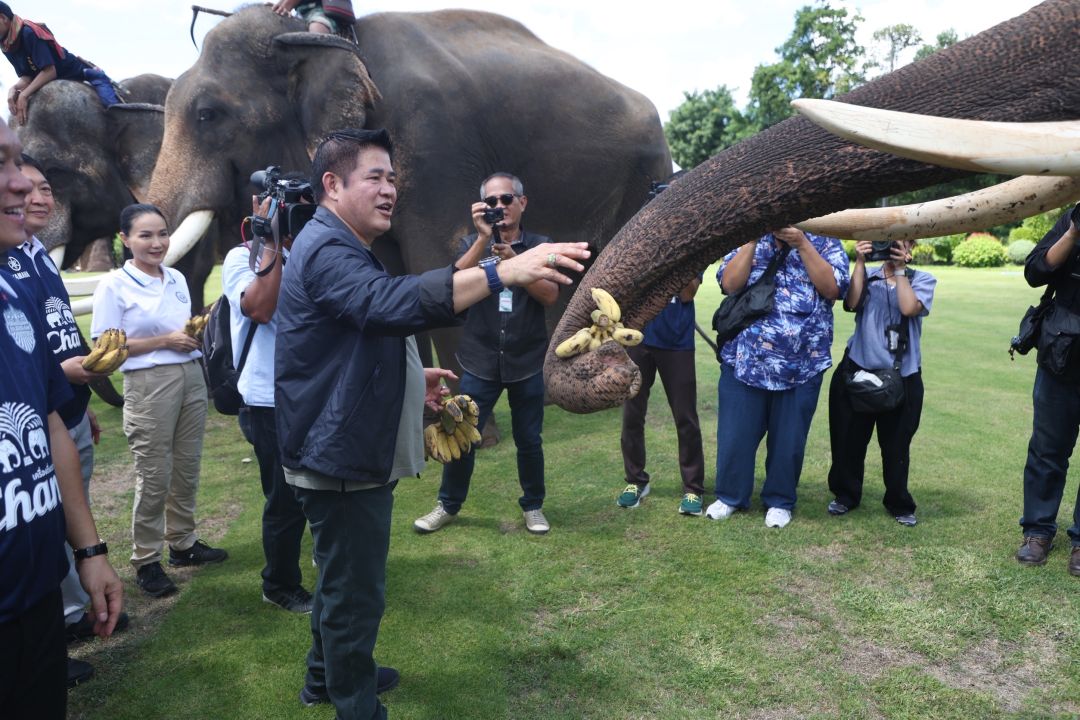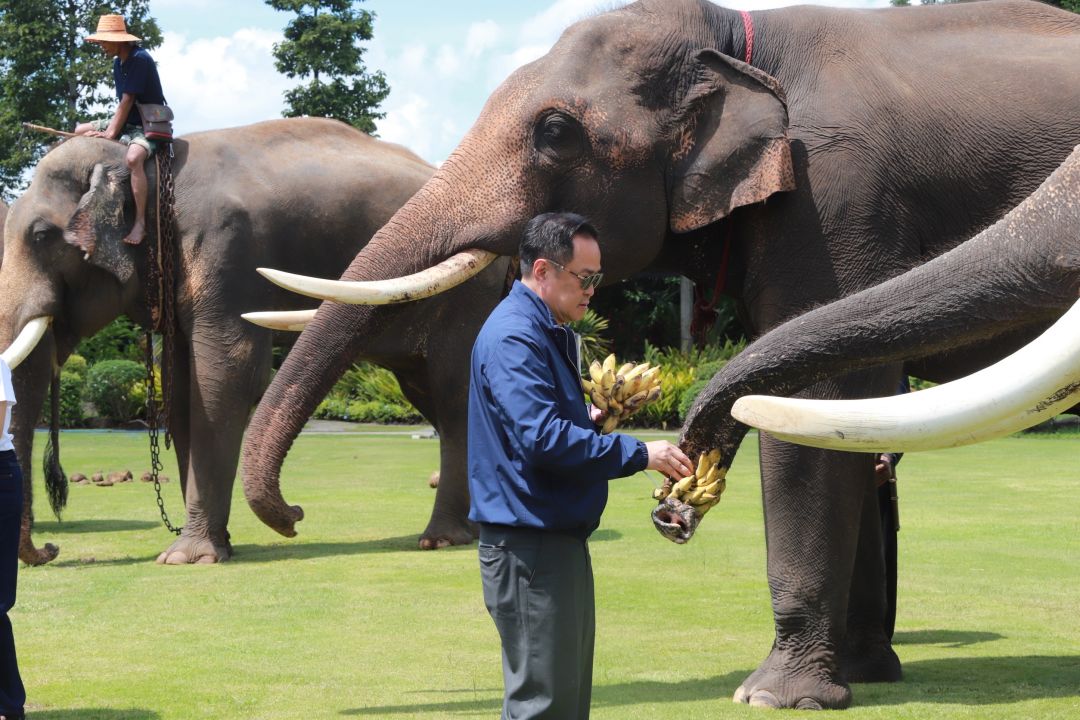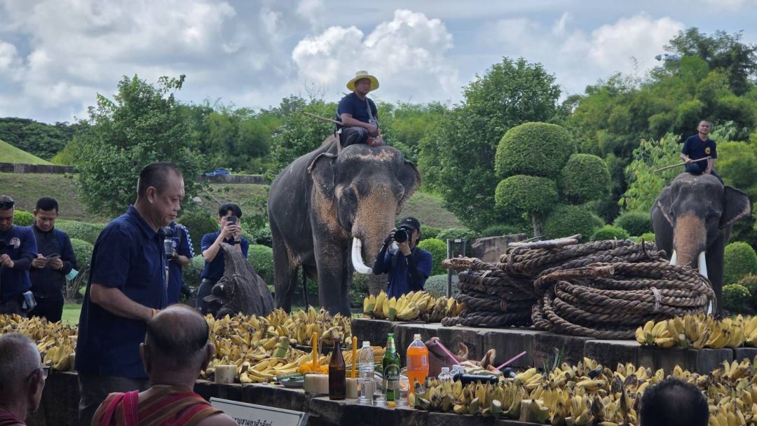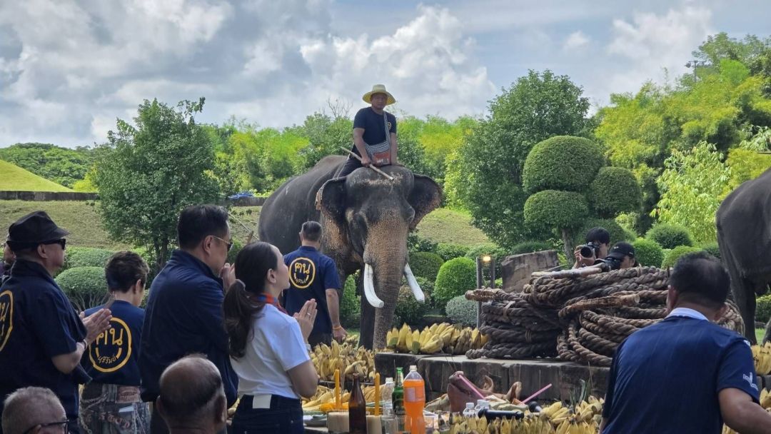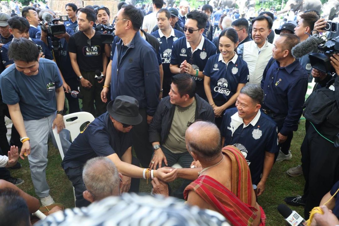 ต่อมาเวลา 10.50 น. นายอนุทิน ชาญวีรกูล นายกรัฐมนตรี และรมว.มหาดไทย ซึ่งเดินทางมาจากกรุงเทพมหานคร ถึงบริเวณสถานที่จัดงาน โดยทันทีที่พบกับนายเนวิน นายเนวินได้สวมกอดนายอนุทิน ก่อนจะเข้าสู่พิธีปะกำช้างจำนวน 10 เชือก ซึ่งเป็นพิธีที่ตระกูลชิดชอบสืบทอดมายาวนาน โดยมีคนในตระกูลชิดชอบ อย่างนายเนวิน พล.ต.อ.เพิ่มพูน นายศักดิ์สยาม ร่วมในพิธี หลังจากนั้นบรรดาผู้ร่วมงานได้นำกล้วยน้ำวามาป้อนช้าง เพื่อความเป็นสิริมงคล ตามความเชื่อ และได้มีพิธีผู้ข้อมือเรียกขวัญ เพื่อขอพรจากหมอช้างด้วย