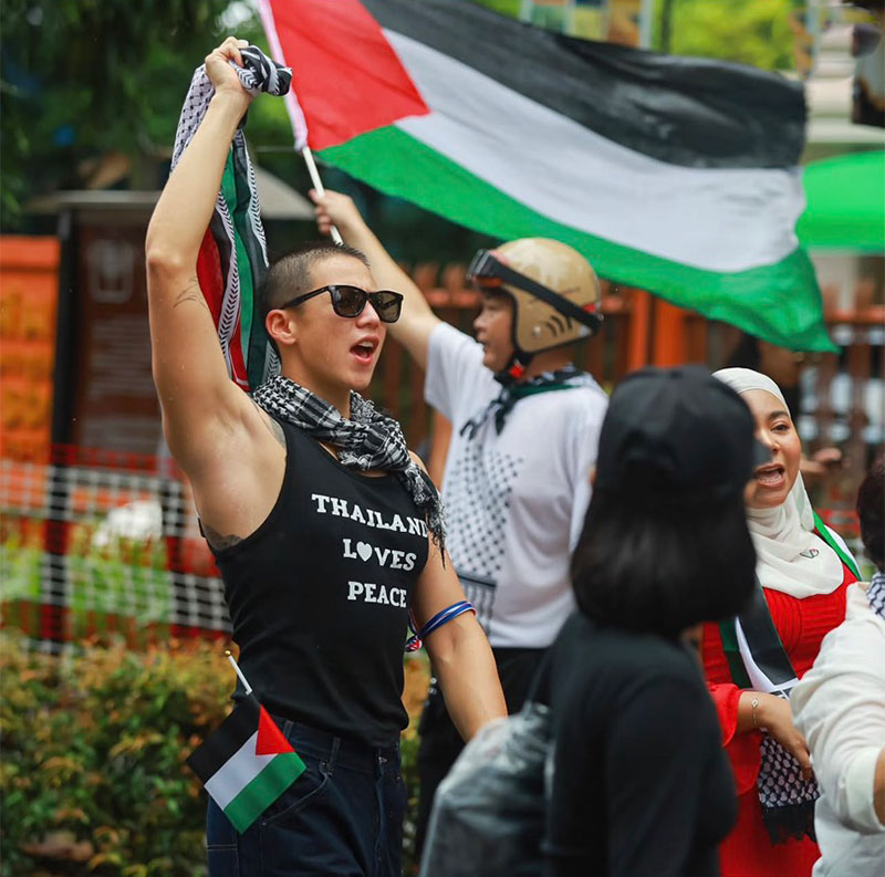 6 ตุลาคม 2568 นอกจากจะเป็นนักอนุรักษ์ทางทะเลแล้ว ล่าสุด 'ทราย สก๊อต' หรือ 'สิรณัฐ สก็อต' ได้ออกมาโพสต์ร่ายยาวหลังร่วมม็อบปาเลสไตน์ บุกชุมนุมหน้าสถานทูตอิสราเอลประจำประเทศไทย เรียกร้องให้รัฐบาลคว่ำบาตรอิสราเอล โดย 'ทราย สก๊อต' ออกมาโพสต์ข้อความผ่านไอจีส่วนตัว "@psiscott" ระบุว่า Killing children is not politics, it is inhumane.เรื่องที่กาซ่าเกี่ยวกับไทยอย่างไร?