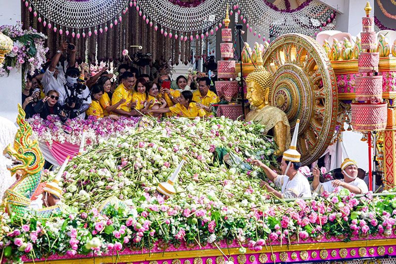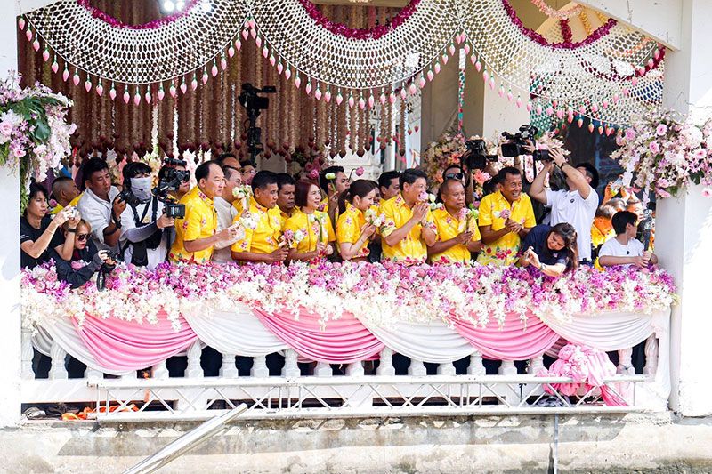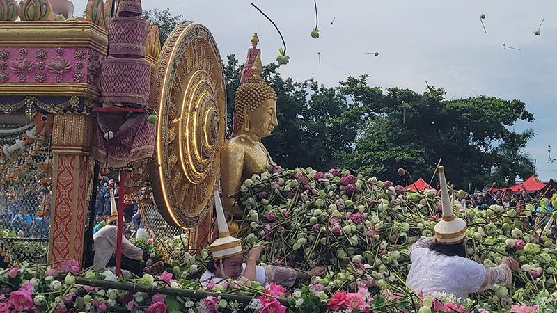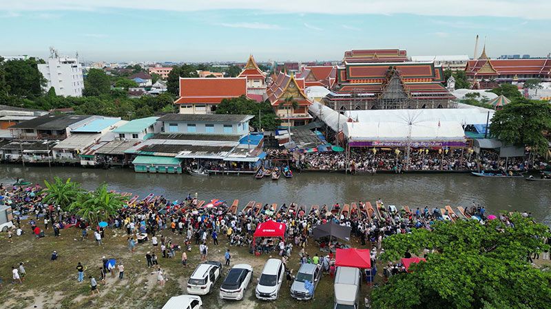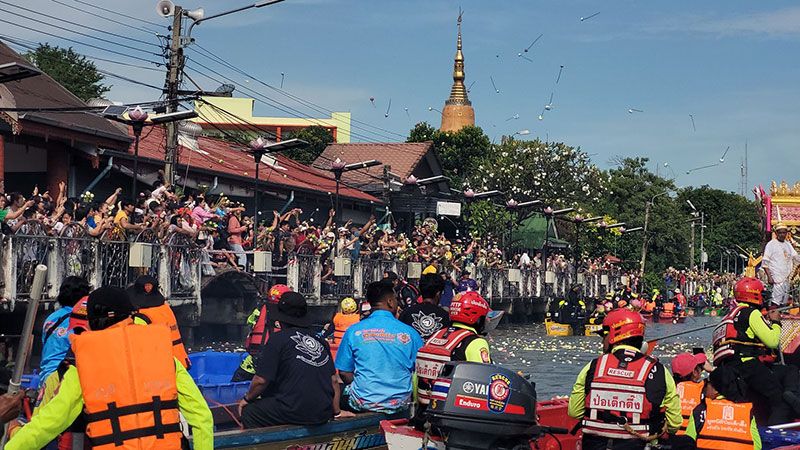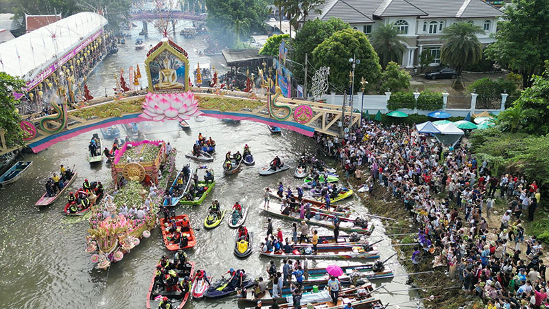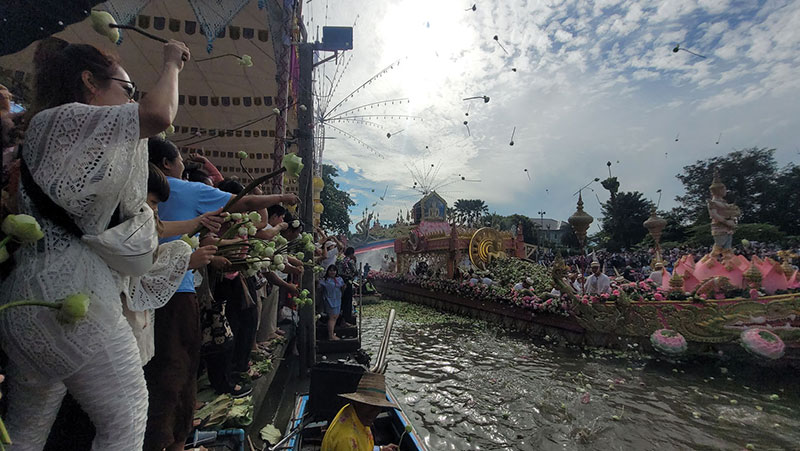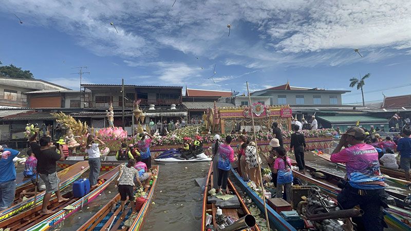 ประชาชนสองฝั่งคลองสำโรงร่วมอธิษฐานโยนบัวคึกคักในงานประเพณีรับบัว 2568