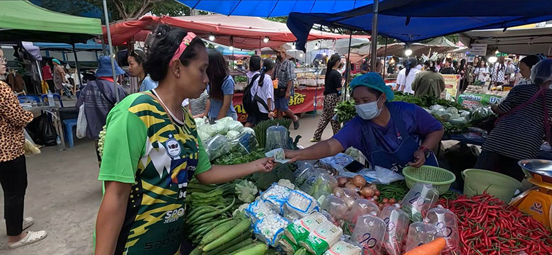 ประชาชนในพื้นที่แนวชายแดนไทย-กัมพูชา อ.บ้านกรวด จ.บุรีรัมย์ แห่กดเงินเยียวยาผู้ประสบภัยฯ 5,000 บาท ออกมาจับจ่ายใช้สอยเลือกซื้อ ของกินของใช้ และสินค้าข้าวของเครื่องอุปโภค-บริโภค ที่ตลาดสด และร้านค้าต่างๆ ส่งผลให้การค้าขายแนวชายแดนจากที่เงียบเหงา กลับมาคึกคักอีกครั้ง