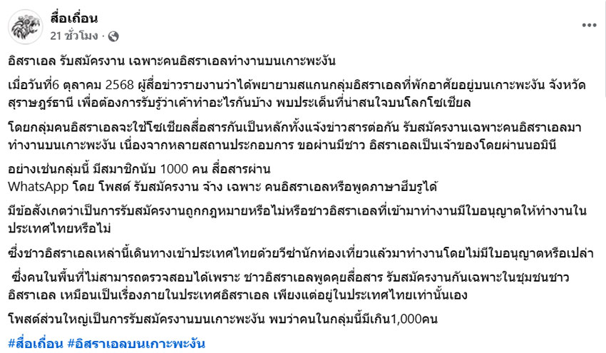เพจเฟซบุ๊ก สื่อเถื่อน รายงานว่า อิสราเอล รับสมัครงาน เฉพาะคนอิสราเอลทำงานบนเกาะพะงัน