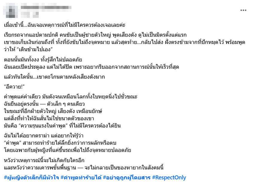 ฉันไม่ได้อยากดราม่า แต่อยากให้รู้ว่า “คำพูด” สามารถทำร้ายได้ลึกยิ่งกว่าการผลักหรือตบ โดยเฉพาะกับผู้หญิงที่แค่ขึ้นรถเพื่อไปถึงจุดหมายปลอดภัย