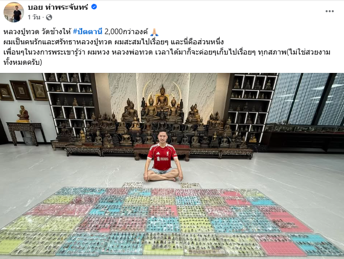 ล่าสุด "บอย ท่าพระจันทร์" ก็ได้มีการโพสต์ภาพเกี่ยวกับความศรัทธาหลวงปู่ทวด พร้อมข้อความระบุว่า "หลวงปู่ทวด วัดช้างให้ #ปัตตานี 2,000 กว่าองค์ ผมเป็นคนรักและศรัทธาหลวงปู่ทวด ผมสะสมไปเรื่อยๆ และนี่คือส่วนหนึ่ง เพื่อนๆ ในวงการพระเขารู้ว่า ผมหวง หลวงพ่อทวด เวลาได้มาก็จะค่อยๆ เก็บไปเรื่อยๆ ทุกสภาพ (ไม่ใช่สวยงามทั้งหมดครับ)"
