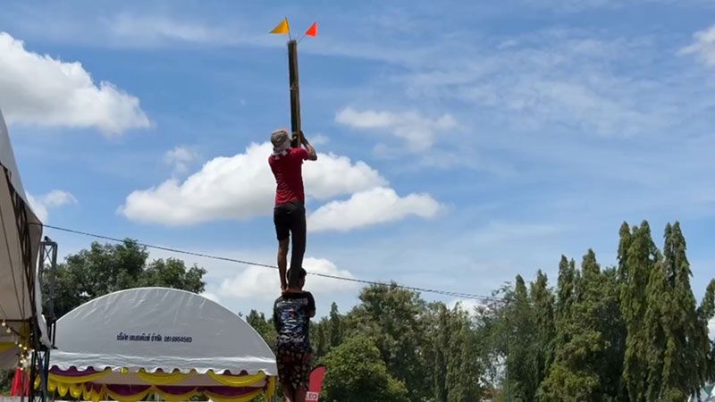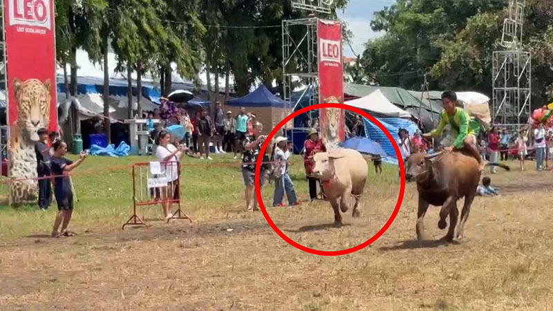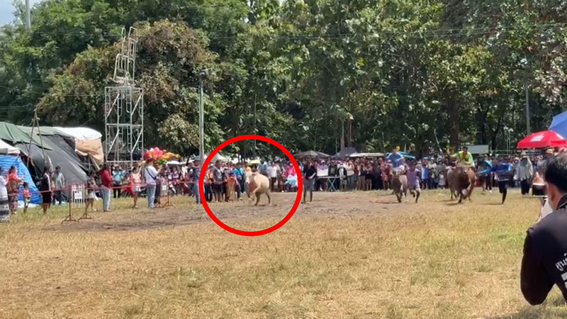 ชาว อ.ปลวกแดง จ.ระยอง ร่วมงานประเพณีวิ่งควาย ช่วงแข่งขันวิ่งควายสุดสนุก คนขี่ตกจากหลังควาย แต่ควายไม่ยอมแพ้วิ่งเข้าเส้นชัยโดยไม่มีคนขี่