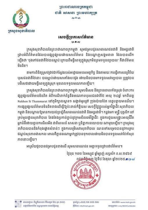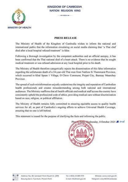 ก.สาธารณสุขกัมพูชา โร่แจงปม'เชฟไทย'เสียชีวิตในปอยเปต หลังรพ.เขมรไม่รับรักษา ชี้เป็นข้อมูลเท็จ ยันยึดมั่นจรรยาบรรณในวิชาชีพ