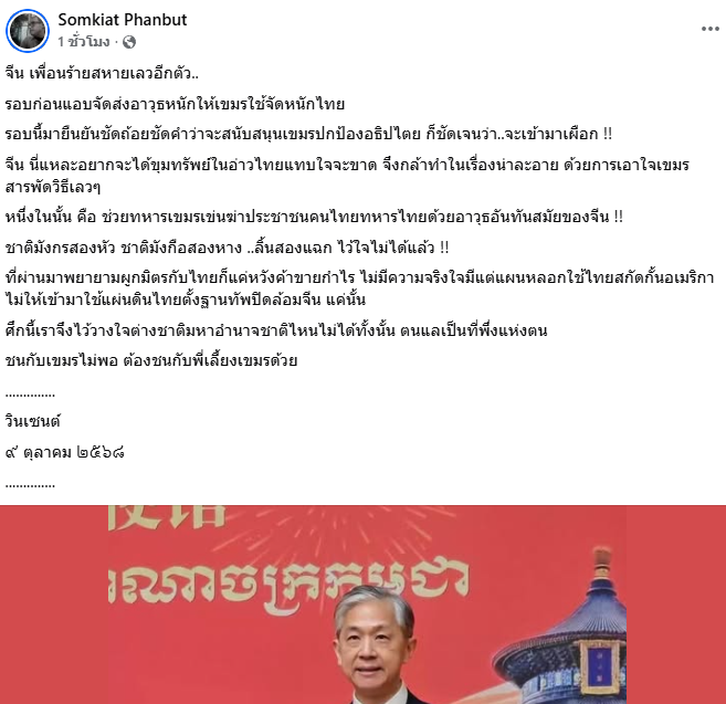 9 ต.ค. 68 วินเซนต์ อินฟลูเอนเซอร์ชื่อดัง ได้โพสต์เฟซบุ๊กส่วนตัว Somkiat Phanbut โดยระบุข้อความว่า "จีน เพื่อนร้ายสหายเลวอีกตัว รอบก่อนแอบจัดส่งอาวุธหนักให้เขมรใช้จัดหนักไทย