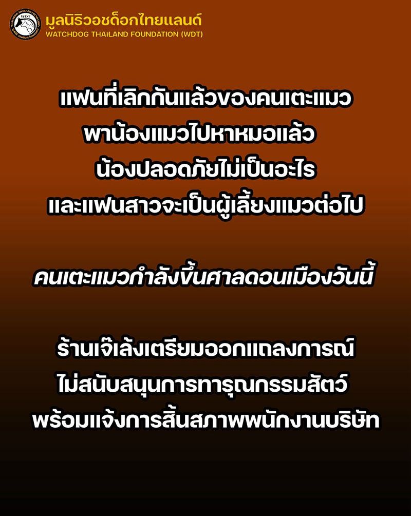 โดยเพจ รักหมาจัง โพสต์อัพเดทอาการแมวตัวที่โดนทำร้ายระบุว่า 'น้องแมวตัวที่โดนเตะปลอดภัยดีค่ะ ตอนนี้แม่ของน้องได้รับน้องทั้งคู่ออกมาดูแลแล้วค่ะ แม่ของน้องบอกว่าน้องยังคงมีอาการตกใจอยู่'