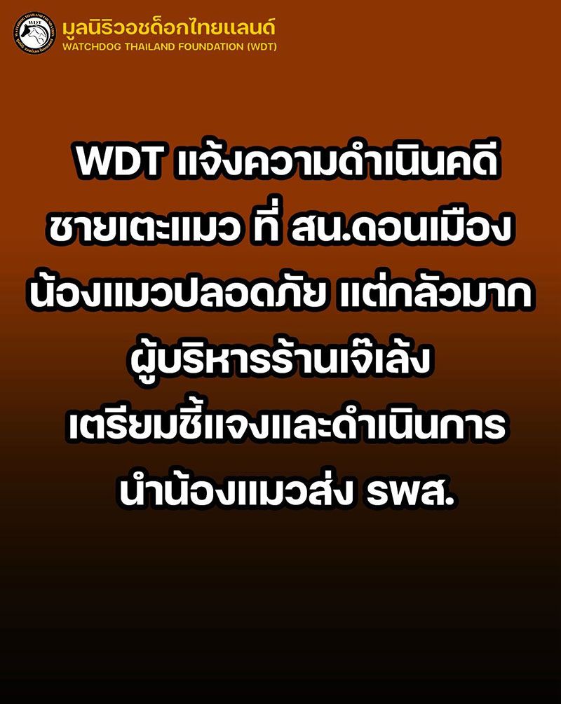 ต่อมาทาง มูลนิธิวอชด็อก ไทยแลนด์ Watchdog Thailand Foundation - WDT ได้แจ้งความดําเนินคดีชายเตะแมว ที่ สน.ดอนเมือง เรียบร้อย