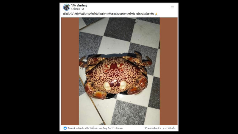 ชาวบ้านที่จังหวัดระยอง ออกหาปลาริมทะเล เจอปูลวดลายแปลกตา นำไปโพสต์ถาม ชาวเน็ตคอมเมนต์เป็นเอกฉันท์ ปูแบบนี้มีพิษห้ามกิน อันตรายถึงชีวิต