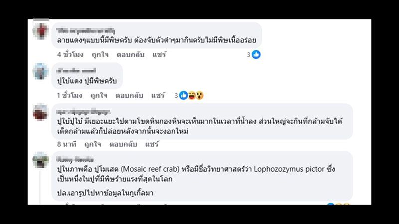 หลังจากชาวเน็ตเห็นโพสต์ดังกล่าว ชาวเน็ตให้ความสนใจและเข้ามาคอมเมนต์ตอบจำนวนมากว่า ปูในภาพเป็นปูมีพิษ ถ้ากินเข้าไปอันตรายถึงชีวิต