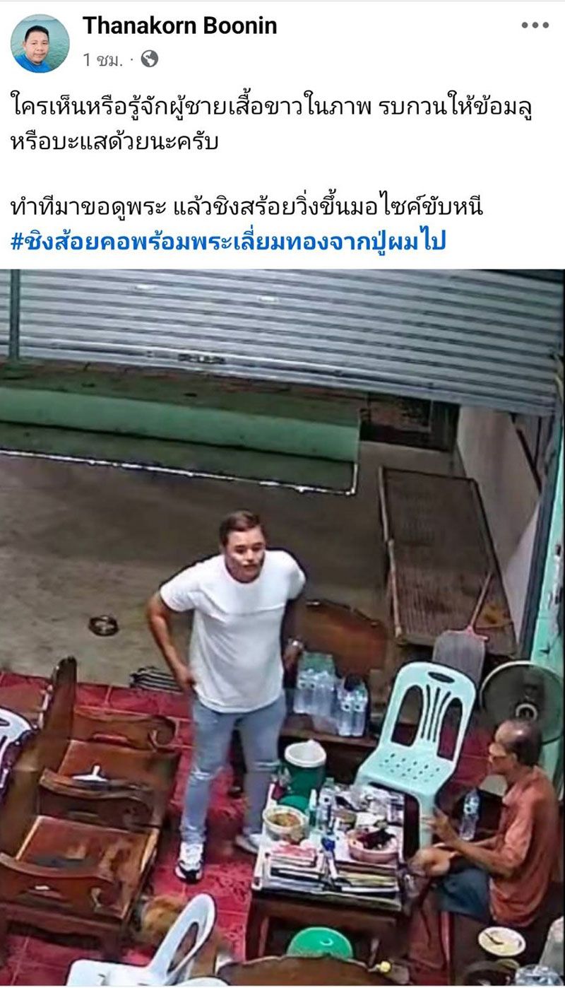 ภายหลังรับแจ้ง เจ้าหน้าที่ชุดสืบสวน สภ.สัตหีบ ลงตรวจสอบกล้องวงจรปิด พบภาพคนร้ายสวมเสื้อสีขาว กางเกงยีนส์ รองเท้าผ้าใบ ทำทีมาขอดูพระ ก่อนค่อยๆ เดินส่องพระออกมาทางหน้าบ้านแล้ววิ่ง ไปขับขี่ จยย.หลบหนีไปทันที ซึ่งเจ้าหน้าที่ตำรวจจะได้ไล่ตรวจสอบภาพจากกล้องวงจรปิดบริเวณใกล้เคียง เพื่อติดตามตัวคนร้ายมาดำเนินคดีตามกฎหมายต่อไป.