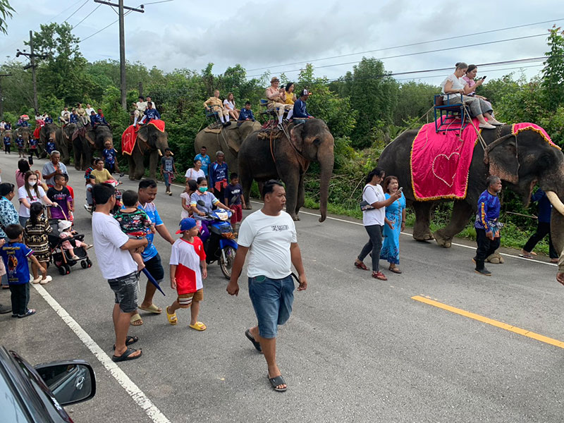 โดยเมื่อช้างมาถึงที่พักสงฆ์ฯ ควาญช้างต้องใช้บันไดให้คณะเจ้าภาพลงจากหลังช้างแต่ละเชือก เพราะช้างย่อตัวได้ไม่นาน จึงเกิดภาพความน่ารักแต่สร้างรอยยิ้มให้กับคณะเจ้าภาพได้เป็นอย่างมาก ซึ่งชาวบ้านมีการซื้อกล้วย อ้อยให้ช้างกินเป็นอาหารจนอิ่มหนำสำราญ