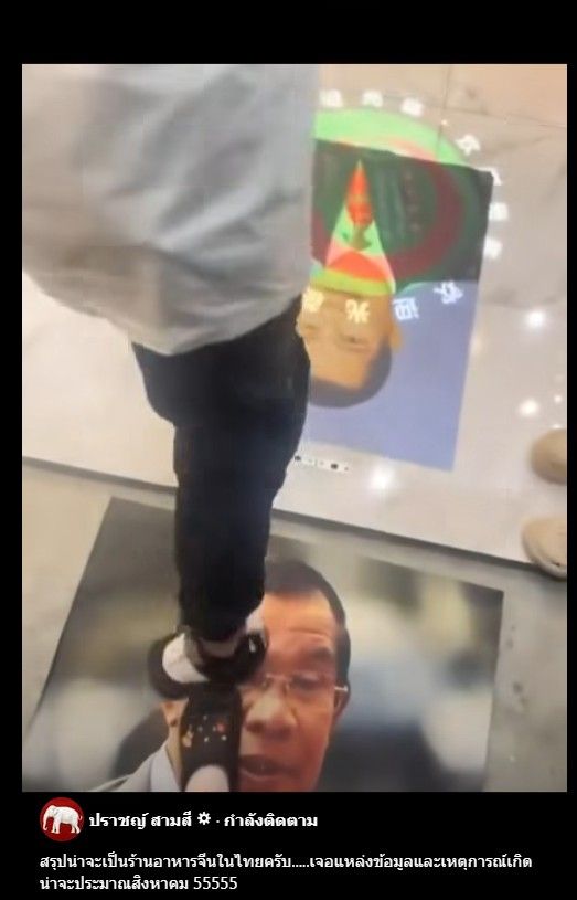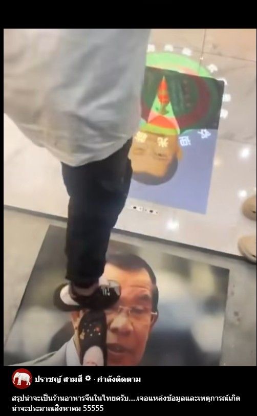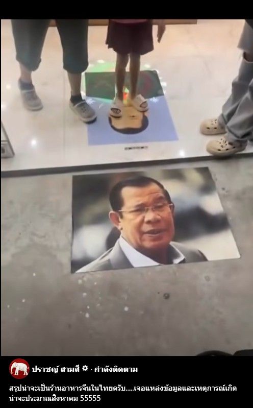 เมื่อวันที่ 12 ต.ค.2568 เพจเฟซบุ๊ก "ปราชญ์ สามสี" ได้โพสต์คลิปวิดีโอร้านอาหารจีนแห่งหนึ่ง มีการติดภาพหน้า ฮุน เซน ประธานวุฒิสภากัมพูชา ไว้บริเวณพื้นหน้าประตูทางเข้าร้านอาหาร โดยในคลิปมีลูกค้าที่กำลังเดินเข้าร้านได้เดินเหยียบบนภาพดังกล่างด้วย โดยโพสต์ระบุข้อความว่า "สรุปน่าจะเป็นร้านอาหารจีนในไทยครับ.....เจอแหล่งข้อมูลและเหตุการณ์เกิดน่าจะประมาณสิงหาคม 55555"