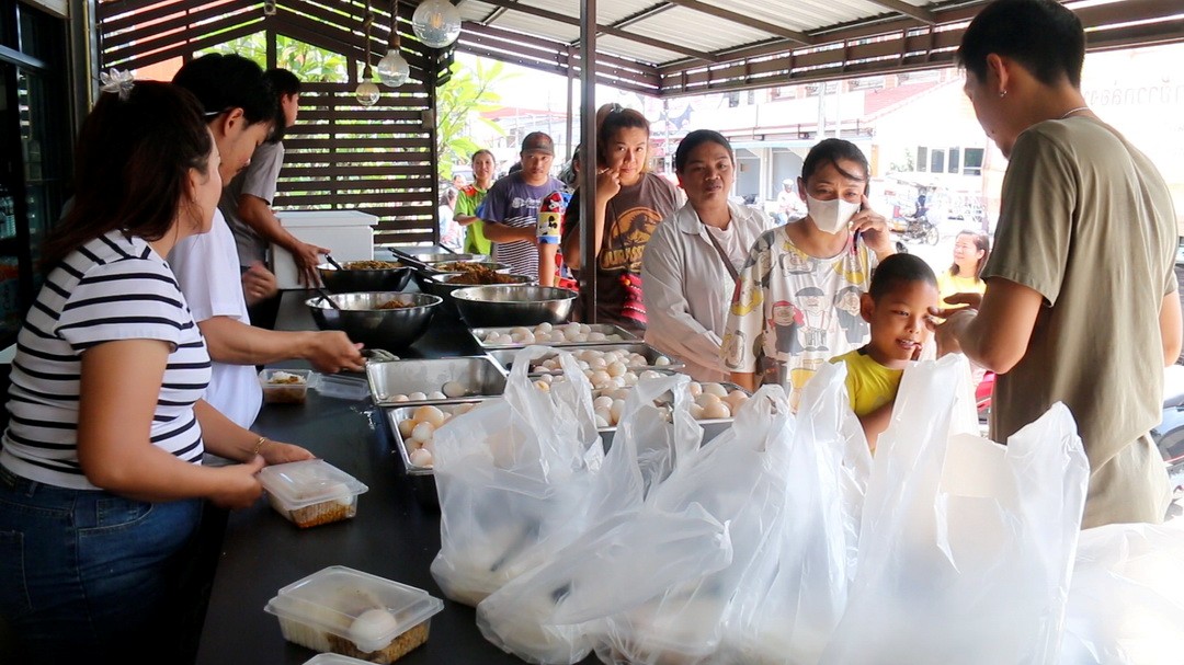 สำหรับเมนูที่ทางร้านนำมาแจกในปีนี้คือ คั่วกลิ้งหมู และ ไข่เป็ดต้ม รวมทั้งหมด 1,500 กล่อง โดยใช้ หมูถึง 100 กิโลกรัม และ ไข่เป็ด 1,500 ฟอง ส่วนข้าวสารนั้นใช้วิธี ‘หุงไปแจกไป’ จนกว่าจะครบตามจำนวนที่ตั้งใจไว้ นางเรณูและลูก ๆ ต้องเริ่มเตรียมวัตถุดิบตั้งแต่เมื่อคืน และตื่นมาทำอาหารตั้งแต่ตีสาม เพื่อให้เสร็จทันแจกในช่วงเช้า