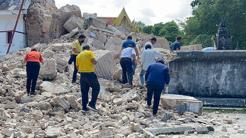 การปูพรมสแกนจะใช้คนเดินบนซากปรักหักพัง ถ้าพบเห็นวัตถุโบราณให้ส่งสัญญาณมือ จากนั้นก็ต้องมาประชุมร่วมกับคณะกรรมการหมู่บ้าน ในการเคลื่อนย้ายเศษอิฐองค์พระธาตุไปไว้ในที่ที่เหมาะสม ส่วนสาเหตุหลักในการโค่นล้ม ก็เหมือนกับพระธาตุองค์อื่นๆ คือการสร้างในแต่ละที่ส่วนใหญ่จะก่อเป็นเปลือกรอบ ตรงกลางจะเป็นโพรงดิน ตราบใดที่น้ำเข้าได้ทำให้น้ำหนักเยอะ ก็จะไปอิ่มตัวอยู่ในผนังแล้ว มันก็จะบวมและออกข้าง ลักษณะนี้อาจเกิดการระเบิดจากภายในได้