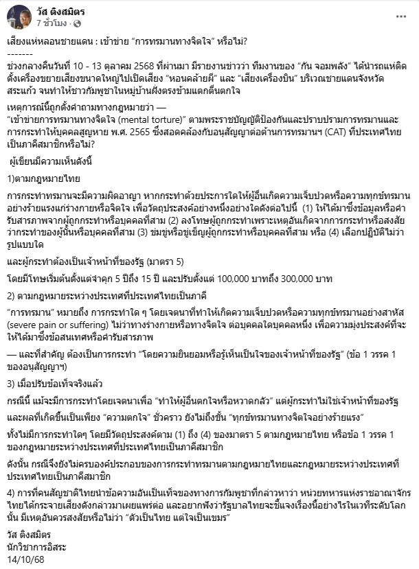 14 ตุลาคม 2568 นายวัส ติงสมิตร นักวิชาการอิสระ อดีตผู้พิพากษาอาวุโสในศาลฎีกา และอดีตประธานกรรมการสิทธิมนุษยชนแห่งชาติ (กสม.) โพสต์เฟซบุ๊ก หัวข้อ “เสียงแห่หลอนชายแดน : เข้าข่าย “การทรมานทางจิตใจ” หรือไม่?” ระบุว่า...