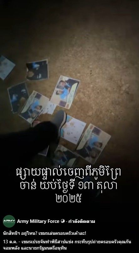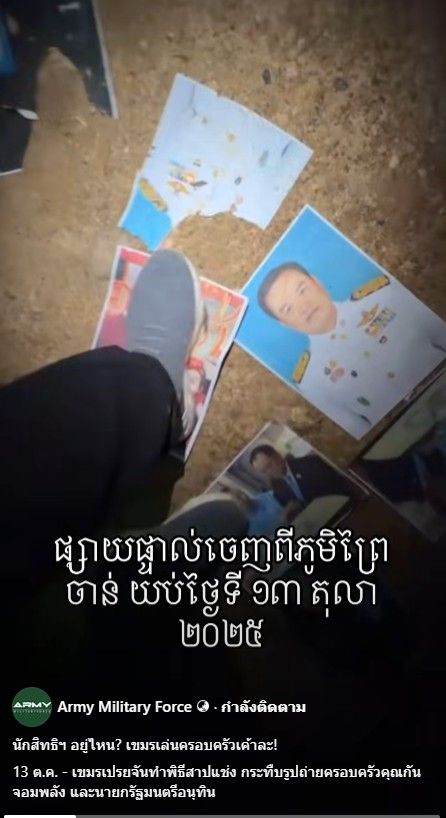 เมื่อวันที่ 14 ต.ค.2568 เพจเฟซบุ๊ก "Army Military Force" ได้โพสต์คลิปวิดีโอขณะชาวเขมรเหยียบและกระทืบภาพ "กัน จอมพลัง" และครอบครัว รวมถึงภาพนายกอนุทิน ชาญวีรกูล นายกรัฐมนตรี และรัฐมนตรีว่าการกระทรวงมหาดไทยด้วย โดยในคลิปชายเขมรได้มีการพูดด้วยว่า "แม่อนุทิน อันนี้แม่อนุทิน" โดยเพจได้ระบุข้อความว่า "นักสิทธิฯ อยู่ไหน? เขมรเล่นครอบครัวเค้าละ! 13 ต.ค. - เขมรเปรยจันทำพิธีสาปแช่ง กระทืบรูปถ่ายครอบครัวคุณกัน จอมพลัง และนายกรัฐมนตรีอนุทิน"