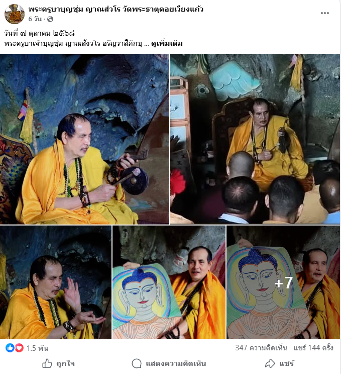 14 ต.ค. 68 เพจเฟซบุ๊ก พระครูบาบุญชุ่ม ญาณสํวโร วัดพระธาตุดอยเวียงแก้ว โพสต์ภาพพระครูบาบุญชุ่ม ญาณสังวโร อรัญวาสีภิกขุ ได้เมตตานำสวดมนต์ ให้ศีลให้พรแก่คณะลูกศิษย์ ที่ได้ร่วมเดินทางเข้าไปนิมนต์ท่านออกจากถ้ำ