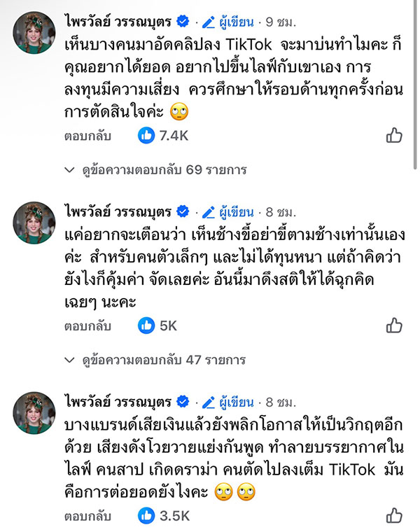 “เห็นบางคนมาอัดคลิปลง TikTok จะมาบ่นทำไมคะ ก็คุณอยากได้ยอด อยากไปขึ้นไลฟ์กับเขาเอง การลงทุนมีความเสี่ยง ควรศึกษาให้รอบด้านทุกครั้งก่อนการตัดสินใจค่ะ”