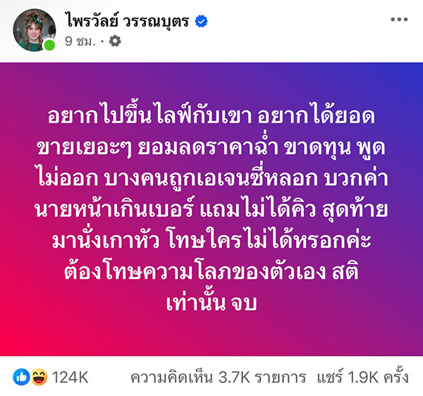 โดยแพรรี่ระบุในโพสต์ว่า "อยากไปขึ้นไลฟ์กับเขา อยากได้ยอดขายเยอะๆ ยอมลดราคาฉ่ำ ขาดทุน พูดไม่ออก บางคนถูกเอเยนซีหลอก บวกค่านายหน้าเกินเบอร์ แถมไม่ได้คิว สุดท้ายมานั่งเกาหัว โทษใครไม่ได้หรอกค่ะ ต้องโทษความโลภของตัวเอง สติเท่านั้น จบ"