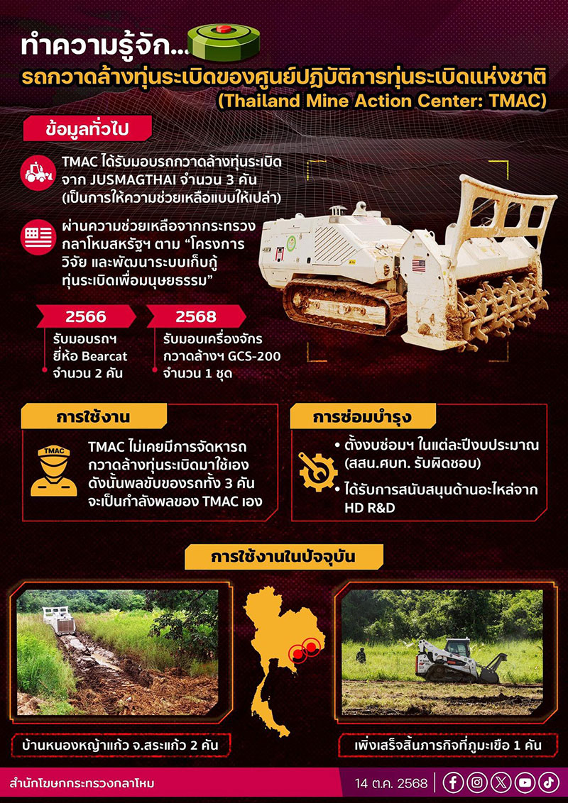 วันที่ 15 ตุลาคม 2568 เพจเฟซบุ๊ก "กระทรวงกลาโหม" โพสต์ข้อความระบุว่า ทำความรู้จัก...รถกวาดล้างทุ่นระเบิดของศูนย์ปฏิบัติการทุ่นระเบิดแห่งชาติ(Thailand Mine Action Center : TMAC)