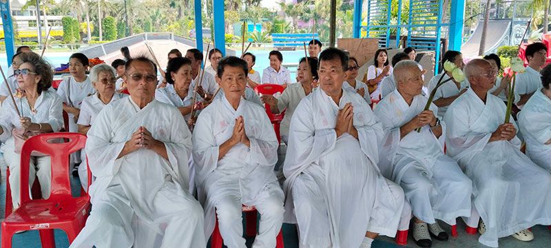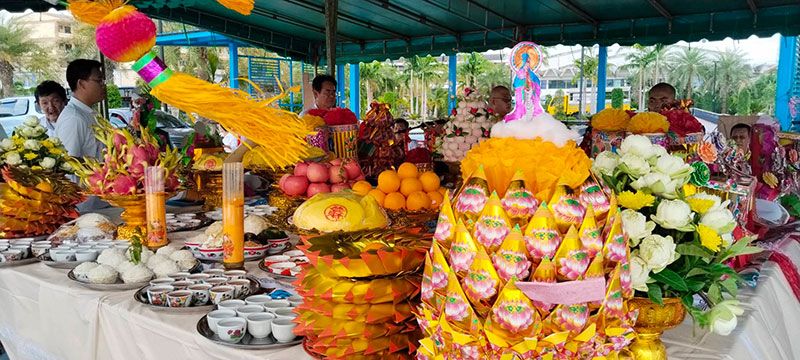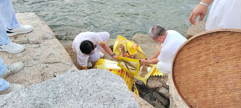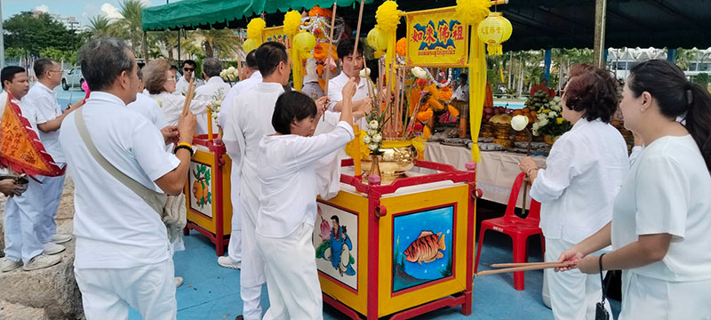 พุทธสมาคมเพียวเยี้ยงไท้ศรีราชาร่วมกับสาธุชน อัญเชิญองค์กิ้วอ้วงฮุกโจ้วที่ชายทะเลเกาะลอย มาเป็นประธานในเทศกาลกินเจ ตามประเพณีและวัฒนธรรมของคนไทยเชื้อสายจีน