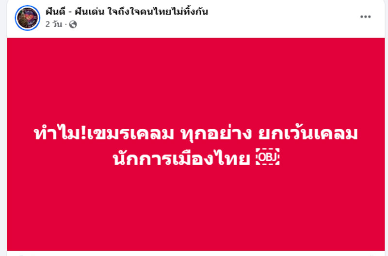 วันที่ 21 ตุลาคม 2568 เพจเฟซบุ๊ก "ฝันดี - ฝันเด่น ใจถึงใจคนไทยไม่ทิ้งกัน" ได้โพสต์สเตตัสเฟซบุ๊ก ระบุว่า "ทำไม!เขมรเคลม ทุกอย่าง ยกเว้นเคลมนักการเมืองไทย"