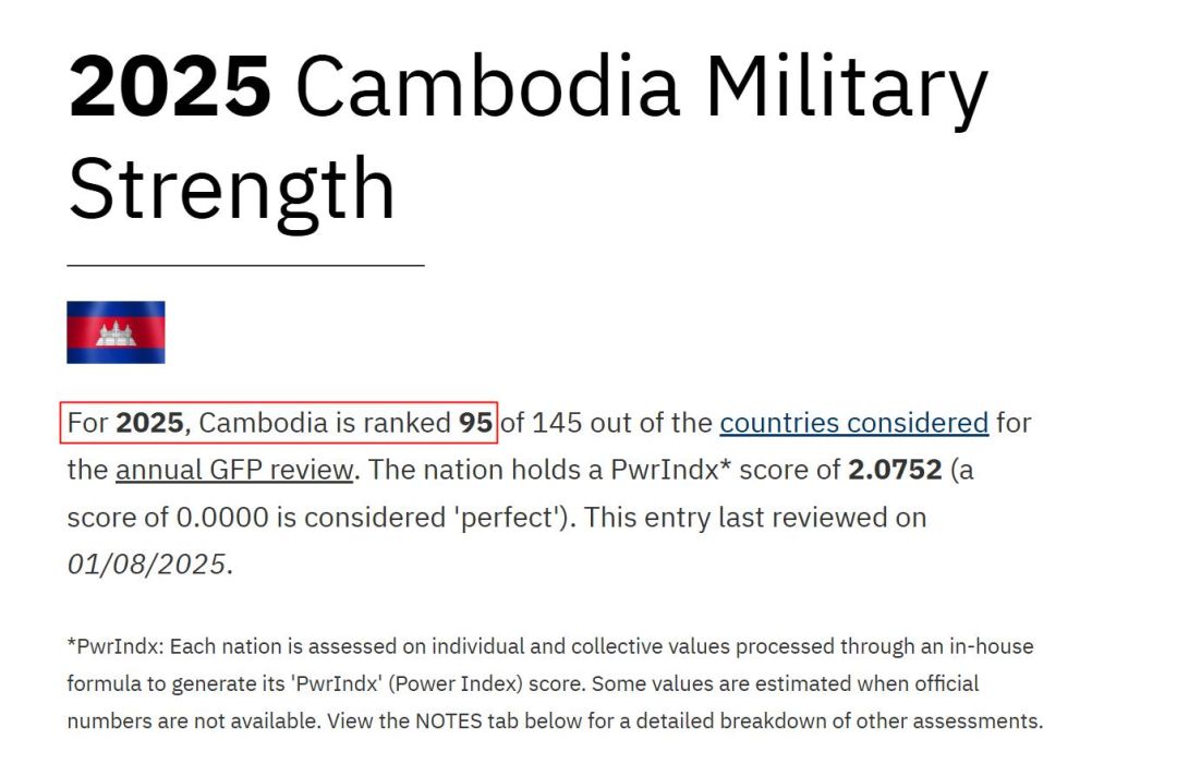 ส่วนประเทศไทยอยู่ในอันดับที่ 25 ของโลก และเป็นรองเพียงอินโดนีเซีย (อันดับ 13 ของโลก) และเวียดนาม (อันดับ 23 ของโลก) ซึ่งถือว่าเป็นความสามารถทางทหารที่มั่นคงและน่าเชื่อถือในภูมิภาคเอเชียตะวันออกเฉียงใต้ (อาเซียน) โดยไม่มีการจัดอันดับของกัมพูชาอยู่ในกลุ่มประเทศที่มีแสนยานุภาพสูงเทียบเท่าข้อมูลเท็จที่ถูกเผยแพร่ออกมา ความจริงจาก Global Firepower Index 2025: กัมพูชาไม่ได้อยู่ใน 10 อันดับแรก